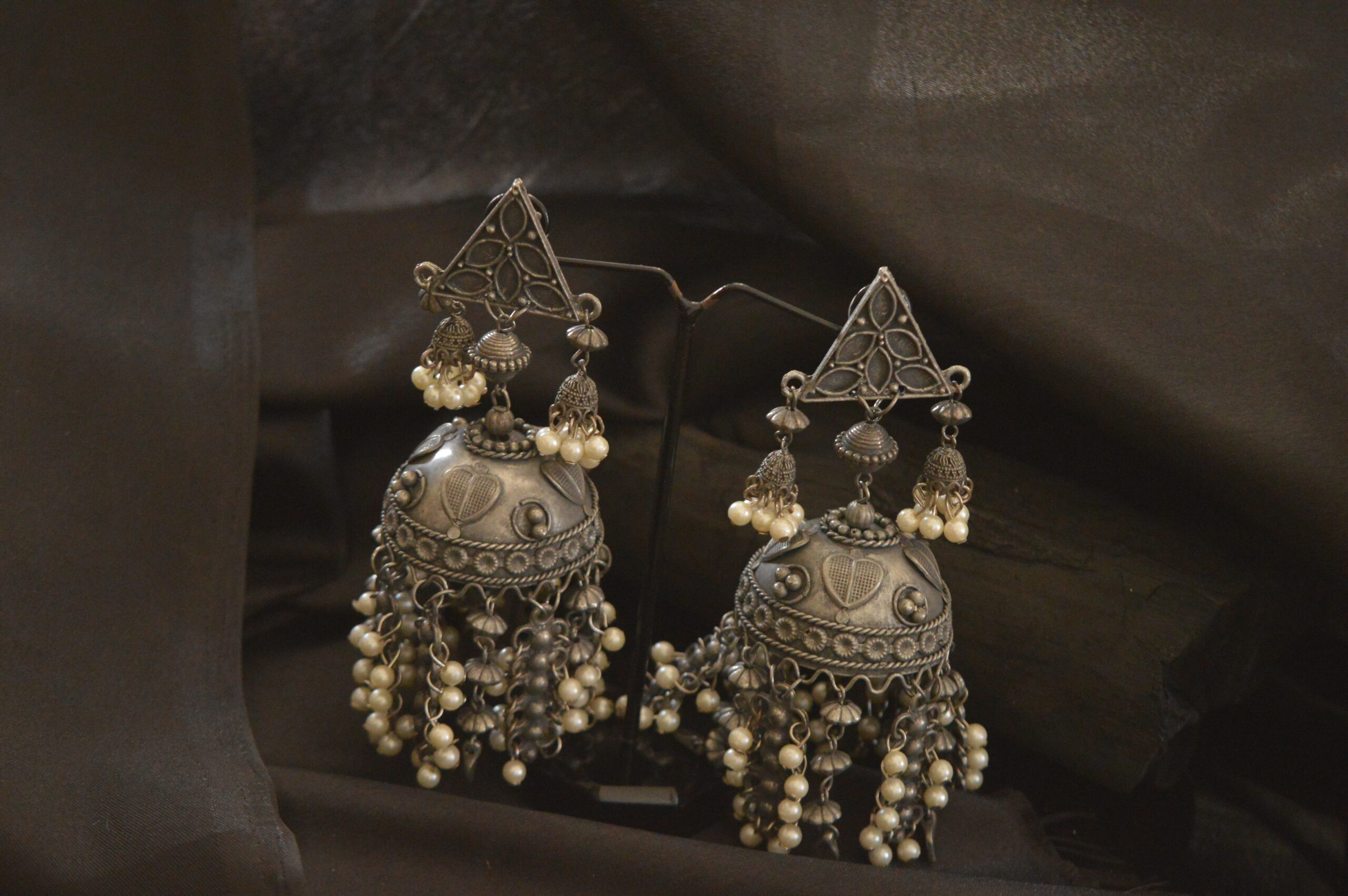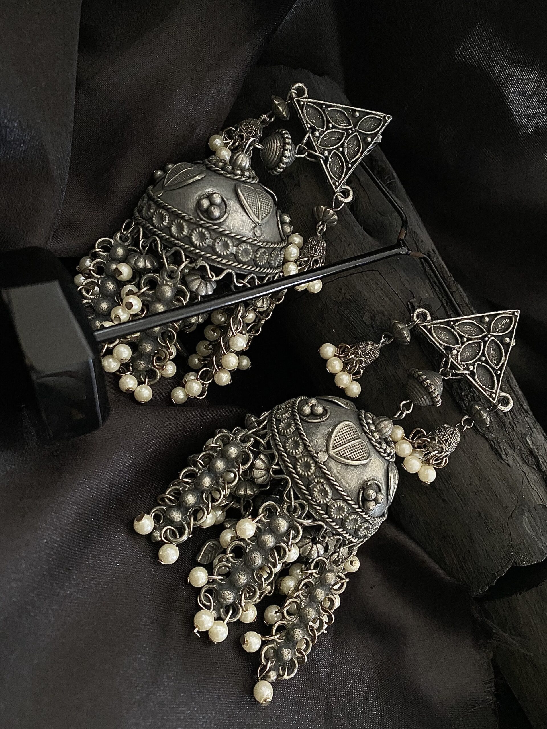 Material : Antique black polish, oxidised silver, pearls